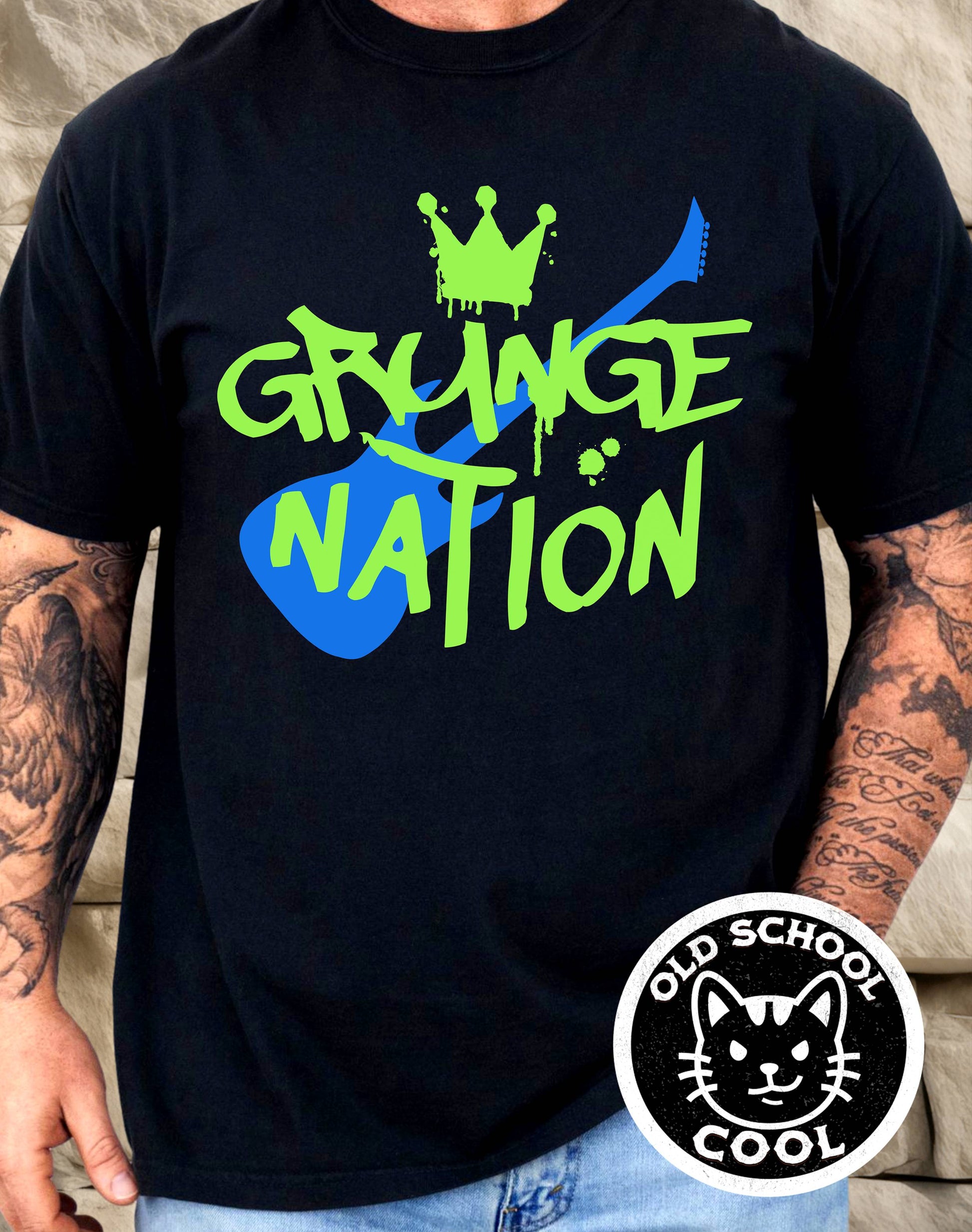 Grunge Nation. Long live the underground. This bold t-shirt features a gritty crown-and-guitar silhouette with dripping paint splatters and a grungy typography art style that screams 90s rebellion. Printed on ultra-soft, vintage-washed Comfort Colors®, it’s made for those who never gave up their Doc Martens, never turned down the volume, and never stopped being loud, raw, and real. Whether you're a Gen Xer, a grunge-loving Boomer, or a parent or grandparent passing down your playlists and flannel collection—this shirt is your badge of honor.