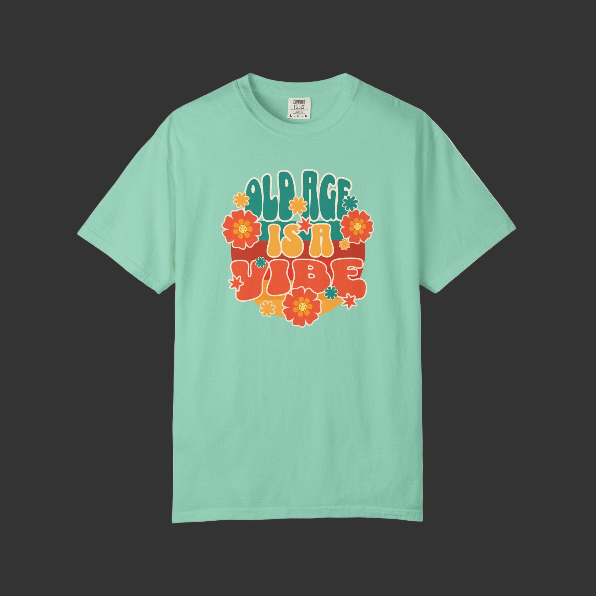 Aging? More like vibing. ✌️ Our "Old Age Is a Vibe" t-shirt brings retro flair and positive energy to the aging process. Designed with bold, boho-inspired typography, this tee makes light of getting older with a cheerful message that says, “Yeah, I’m older — and still cooler than you.” Printed on soft-washed Comfort Colors® fabric, this shirt feels just like a favorite vintage tee — worn-in, relaxed, and ready for everyday wear or a birthday celebration.
